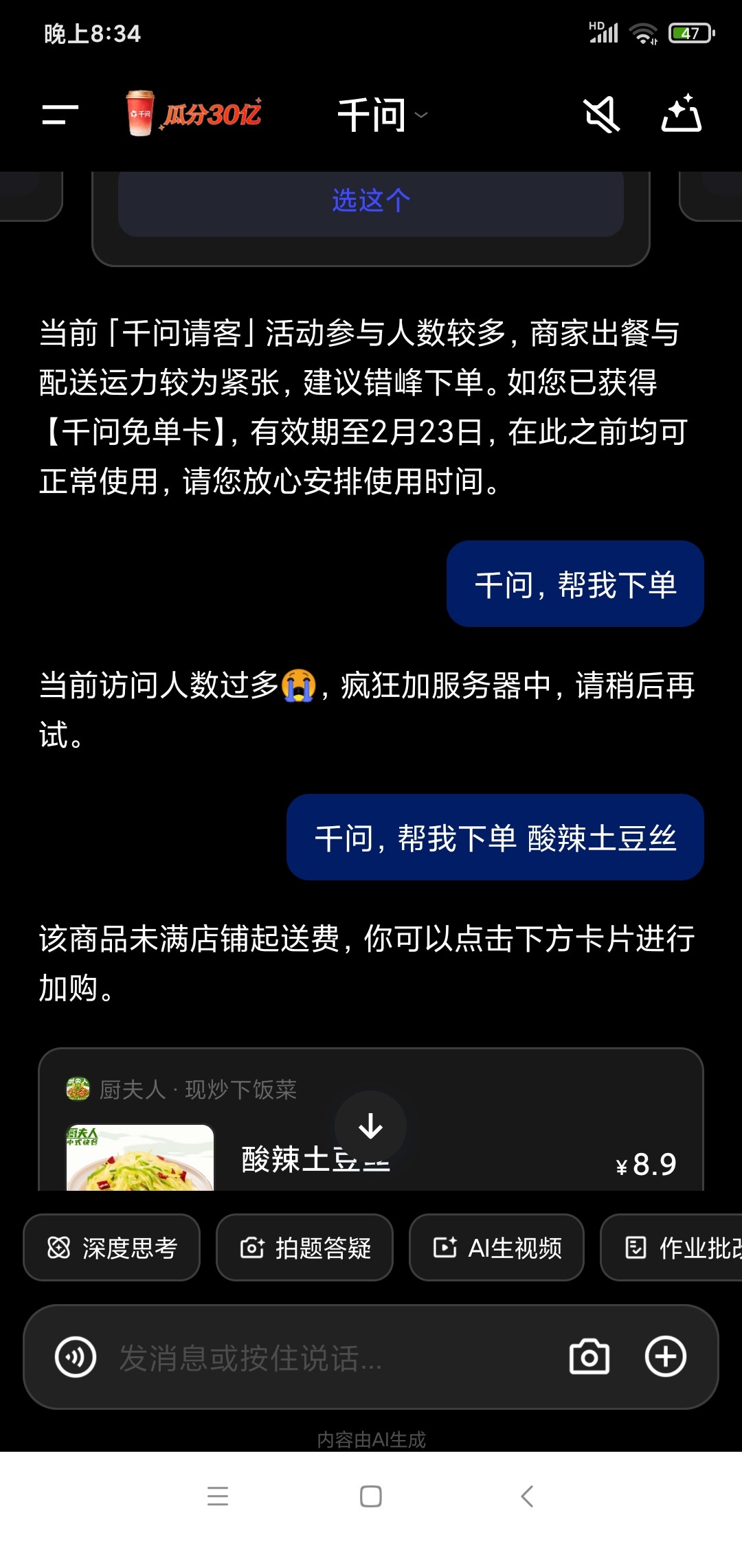 出现可以点的店铺和菜后,点进去,自己挑菜品,默认使用25的劵,然后重复下单,直到下单完成为止,会从你手机号的支付宝自动扣款,我点的0.01就是0.01,支付完成后提示系统卡顿不要怕,登录淘宝就可以查看刚才的订单了