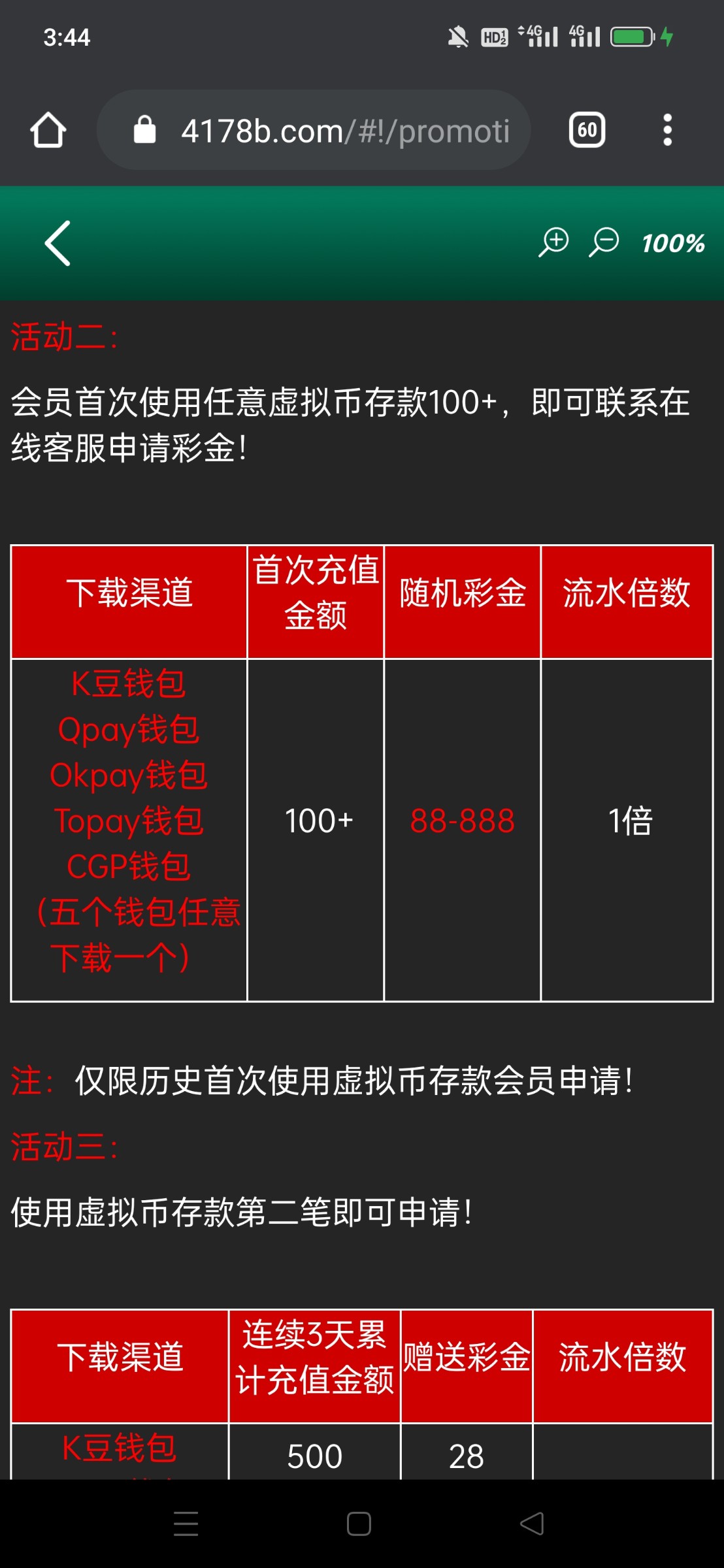 4178b.com历史有使用虚拟币充值过的,回馈58元到绑定的钱包地址,历史没使用虚拟币充值过的,使用虚拟币充100送88