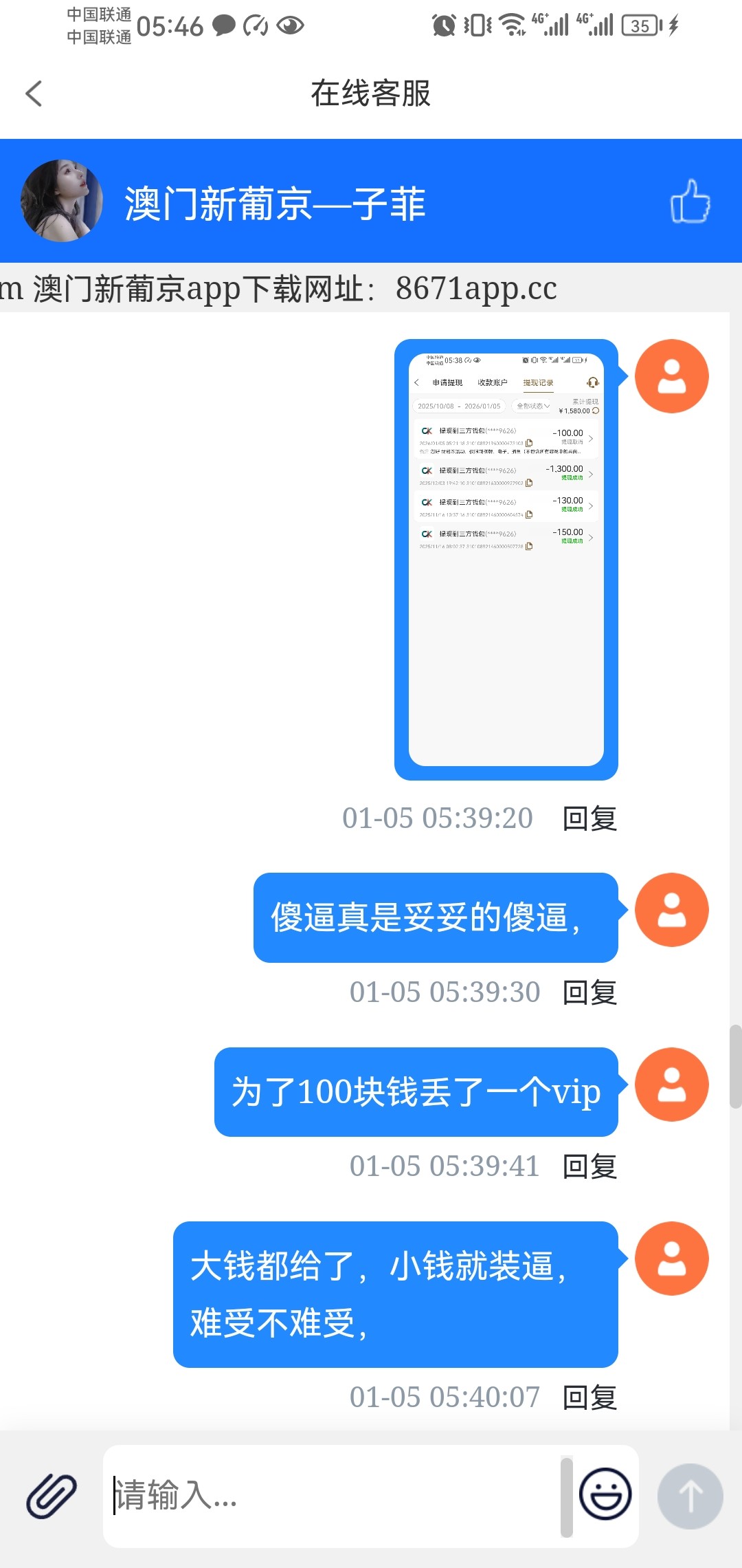 上个月充大几百,这个月领了5块钱,干到100,直接取消出款,这帮狗台没啥钱,玩不起的。