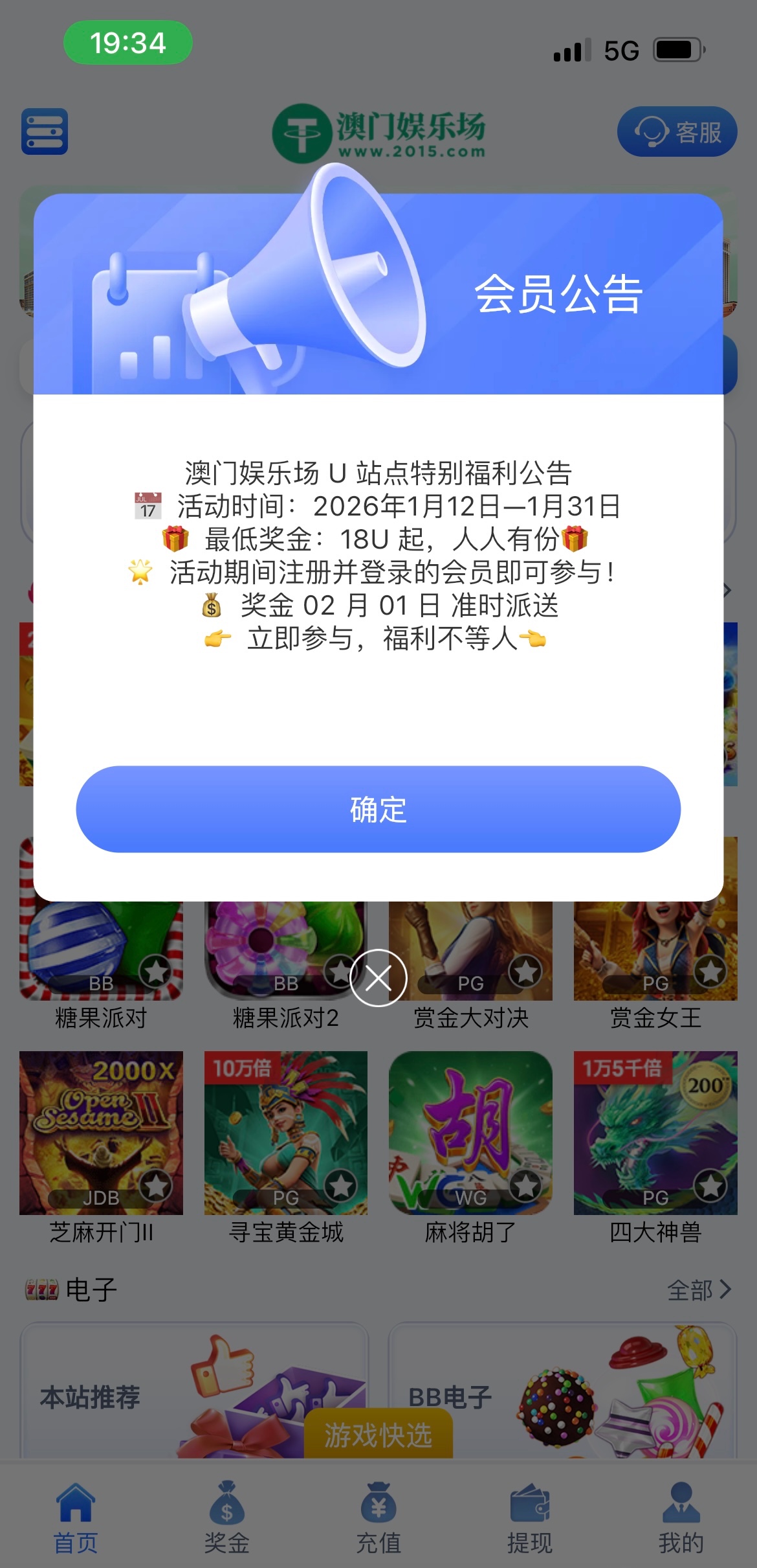 这应该就是活动公告上2.1送18的那个活动了,我一个号很早就注册了这几天充了30u送了,另一个号昨天注册的没充没给,老哥们最近有充值的可以上号看看链接2015.com