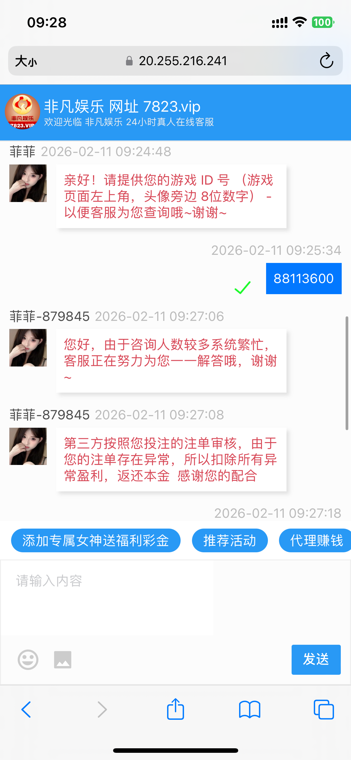7823.vip非凡娱乐,假台子遇到不要玩,直接骂客服,全是假的,赢了不让提,说你注单异常,下一千都没格局,真的畜生,碰到直接打飞,存了个一百玩个首存,这都下不了