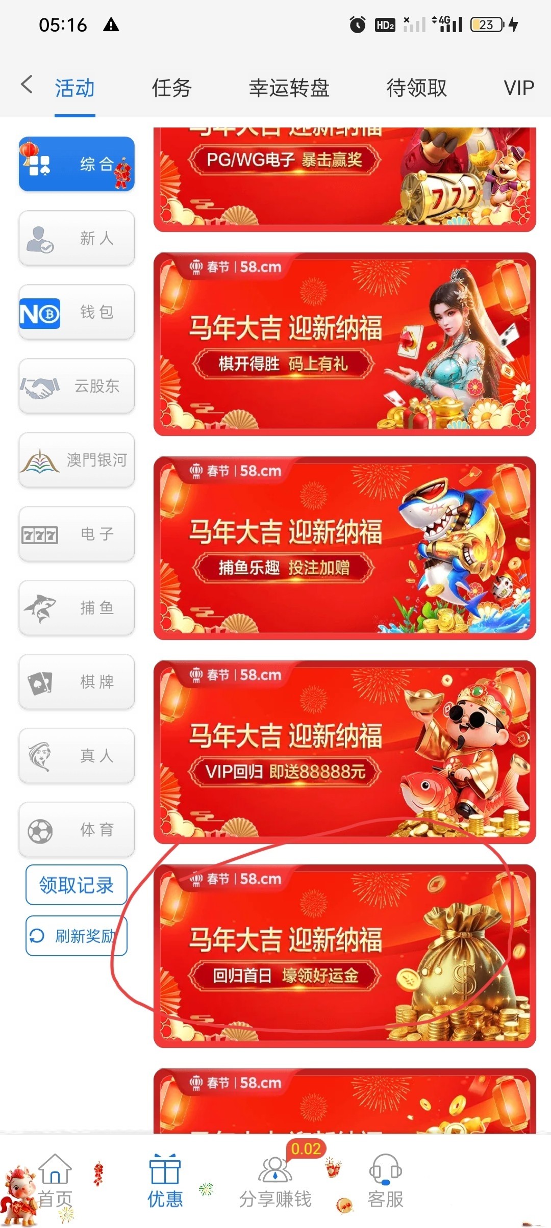 官网58.cm 15号之前充值10块钱可以领等级礼金,然后有会员等级的9天没充值过有流水娱乐过提现的也可以充值十块钱打两赔流水可以申请vip回归彩金