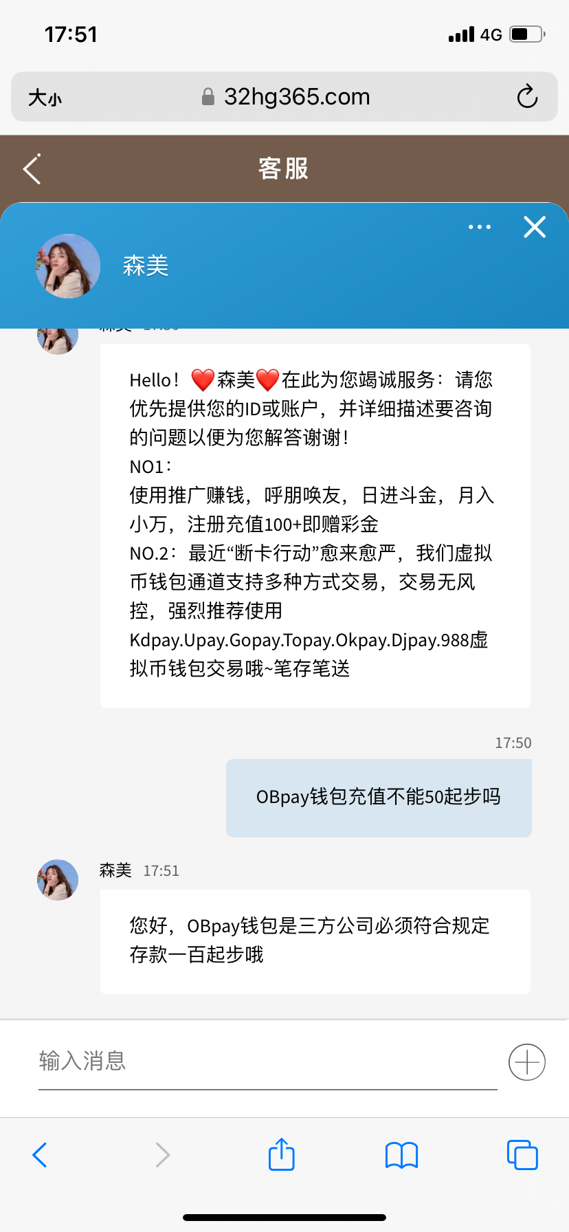 新用户注册实名OBpay钱包 联系钱包客服领取50个币 暂时还没有找到能50起充的平台 找到了我会更新 先去领了放在那里