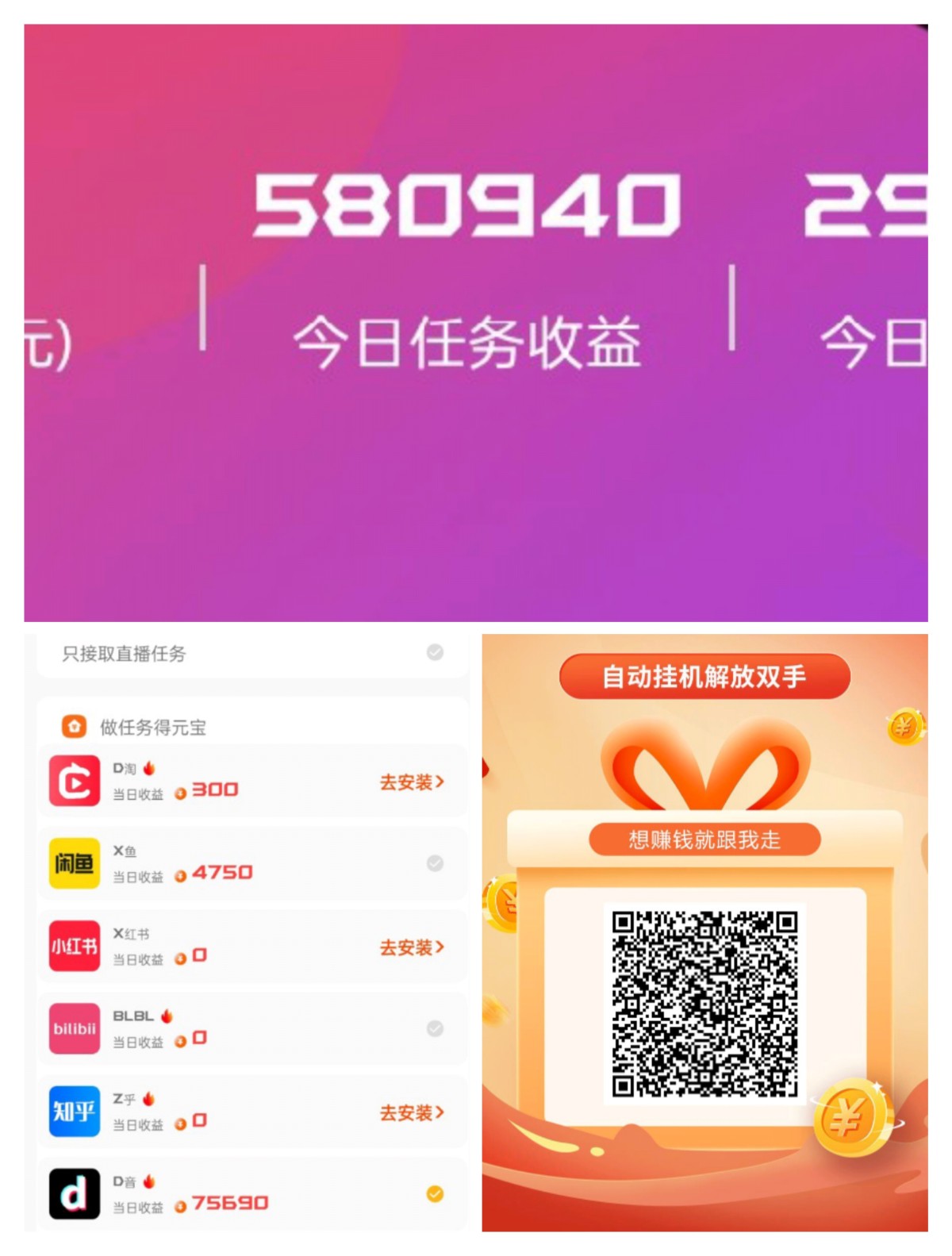 扫码注册下载!根据提示开启无障碍服务器等!无脑挂机!备用机多的挣多点!天低保20+!