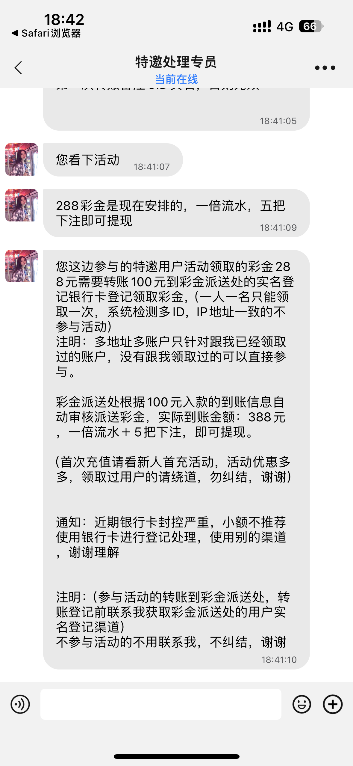 说注册送288但是要我先发100给彩金派送处,然后在一起到账388