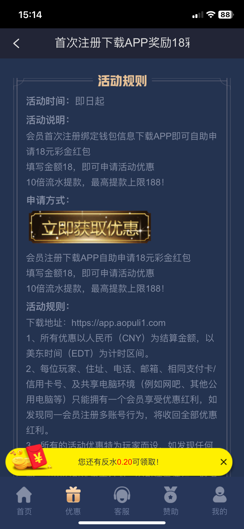 注册下载app,优惠里点击新人见面礼申请,18彩金10倍流水,提现上限最高提188