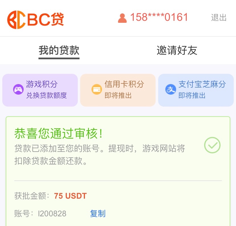 新用户进入网页注册BC贷账号 选择贷款 选择一个BC贷的平台注册绑定收款方式 然后申请贷款 里面填写自己经常玩的平台网址 提供账号密码网址名字 按充值流水等判定下款金额(必须是网页的平台 不能是app) 基本都是28u~285u不等 等待审核通过去玩就行了 赢了扣除贷款金额即可提款 输了无需还款 注意:平台有电话核实 注意接听 贷款平台注册的电话号码