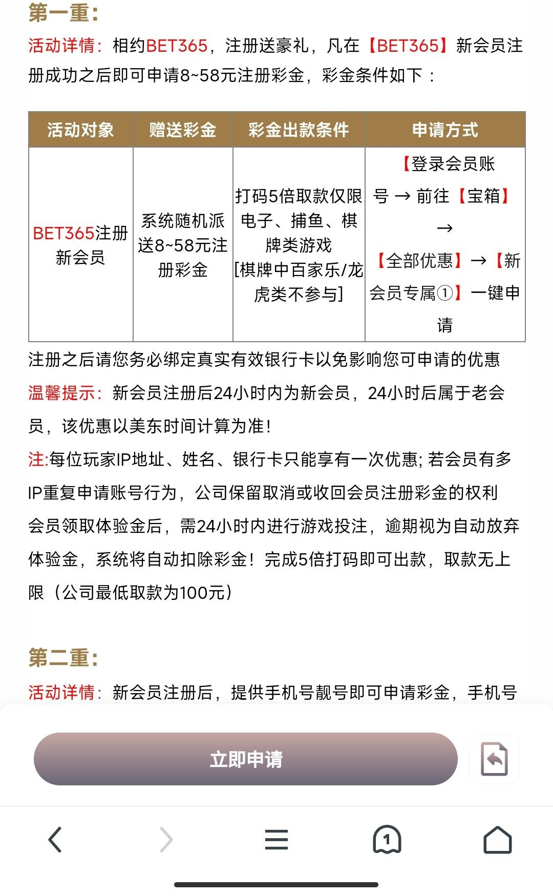 新用户注册绑卡前往宝箱点击新会员专属活动 申请送8/58,有审核时间,限制看下图,勿充值